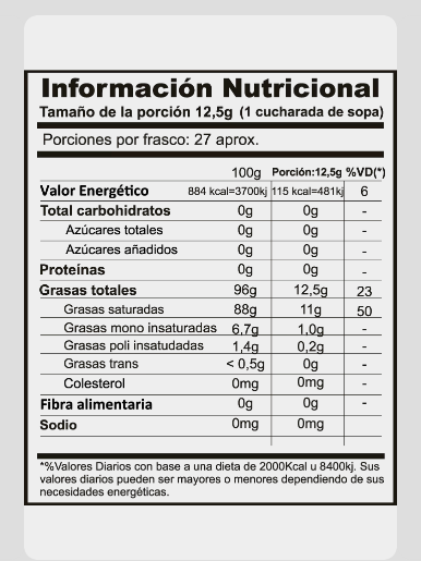 El aceite de coco a más de 23 grados centigrados se torna color dorado claro, se puede \utilizar como reemplazo natural del aceite de girasol para preparaciones dulces y saladas.